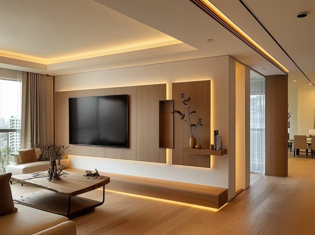 Minimalistyczna ściana telewizora z czystymi i ostrymi geometrycznymi kształtami.