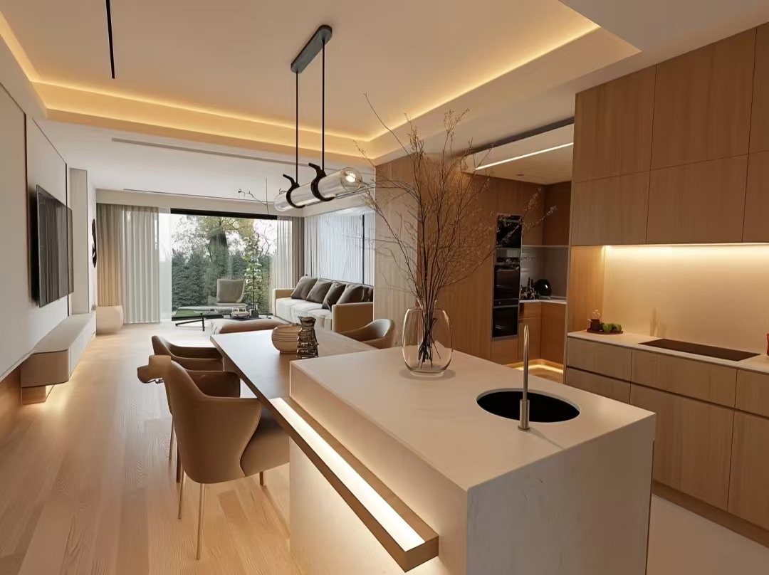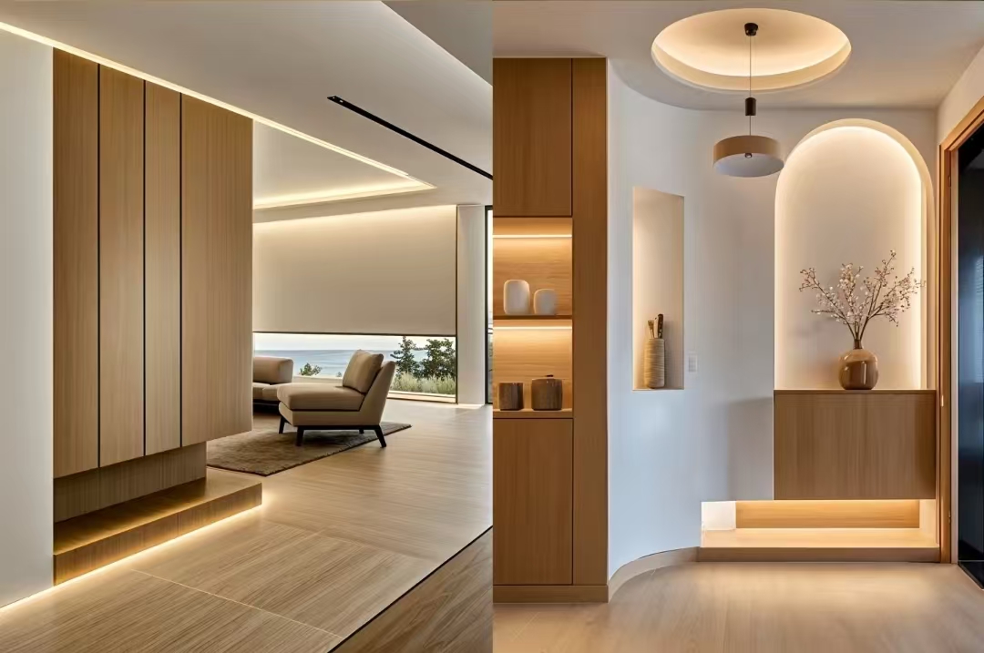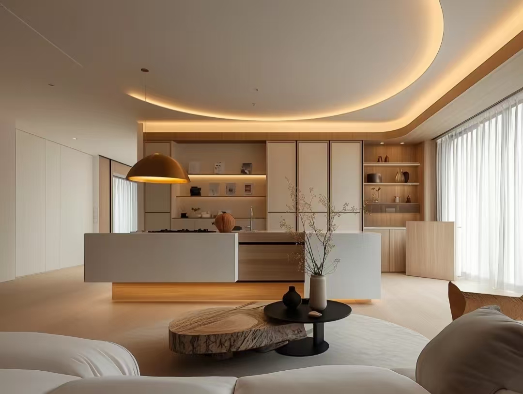 Używając kremowych białych i naturalnych kolorów drewna, aby stworzyć ponadczasowy, długotrwały dom.